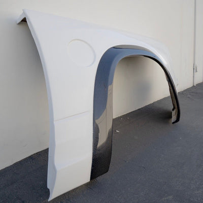 The panels are made from fiberglass (or carbon fiber if requested at an additional cost). We use a proprietary blend of polyester resin which is paired with our fiberglass mat and cloth. This combination of resin and fabric provides the strength and flexibility to make our body panels a superior product.