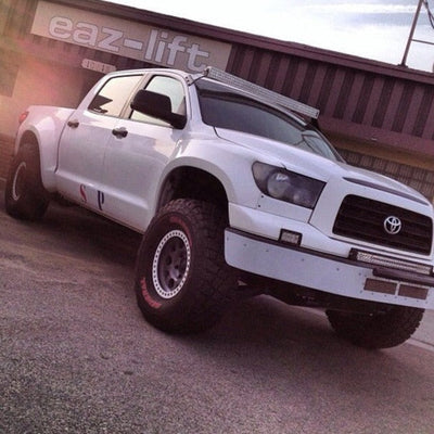 2007-2013 Toyota Tundra fenders, hand-laid in the USA. Price includes set of two fenders (driver and passenger side). Fiberglass fenders come standard in semi-gloss white. Bolt-on installation. These wide Tundra fenders are a perfect match with our 2007-2013 Tundra fiberglass bedsides to create a build that is ready for any terrain.