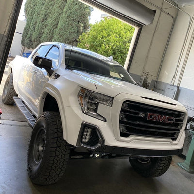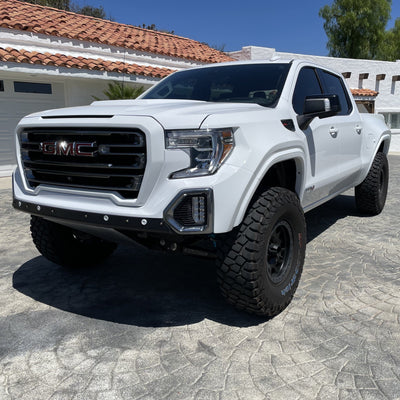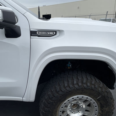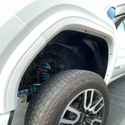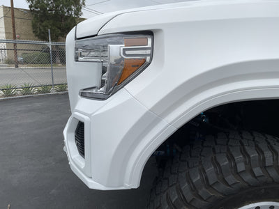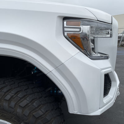 2019-2025 GMC Sierra fender flares, hand-laid in the USA. Price includes set of two fenders (driver and passenger side). Fiberglass fenders come standard in semi-gloss white. Bolt-on installation. These Sierra prerunner fenders are a perfect match with our 2019-2025 Sierra bedsides to create a build that is ready for any terrain.