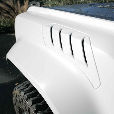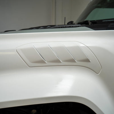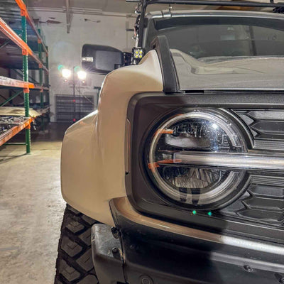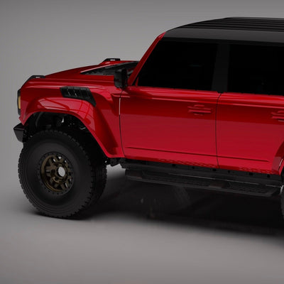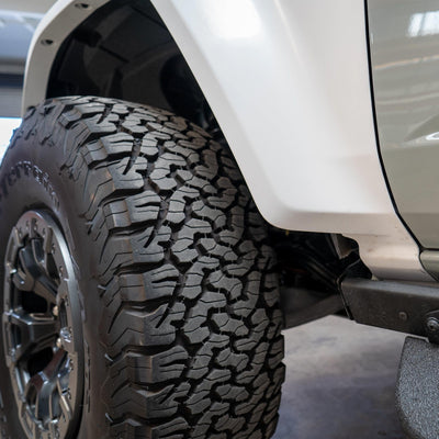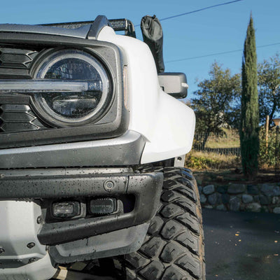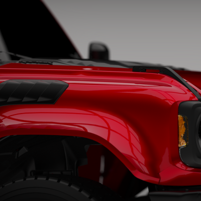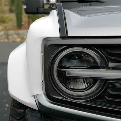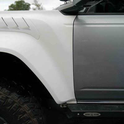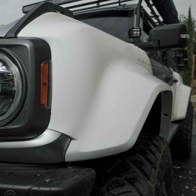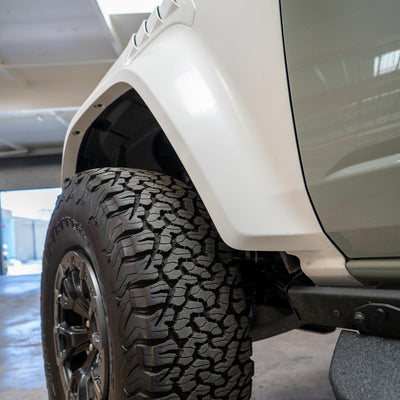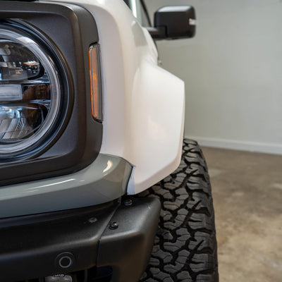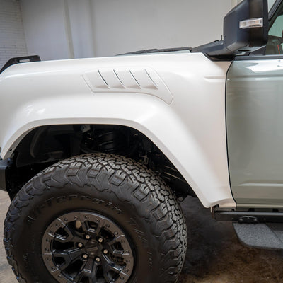 2022-2025 Ford Bronco Raptor flared fenders, hand-laid in the USA. Price includes set of two fenders (driver and passenger side). Fiberglass aftermarket fenders come standard in semi-gloss white. Bolt-on installation. These Ford Bronco fender flares are a perfect match with our 2022-2025 Ford Bronco Raptor Rear Quarter Kit to create a build that is ready for any terrain.