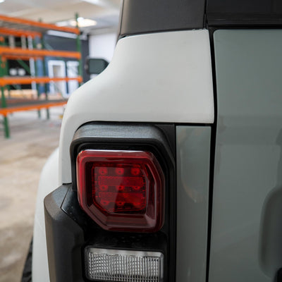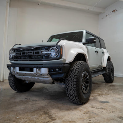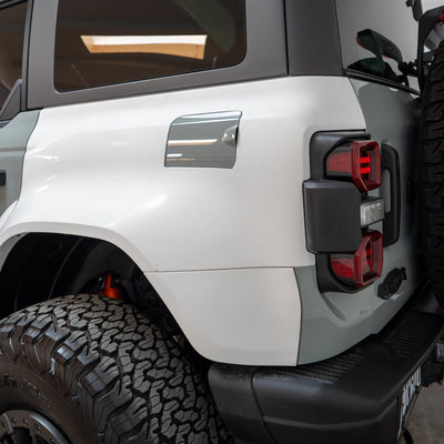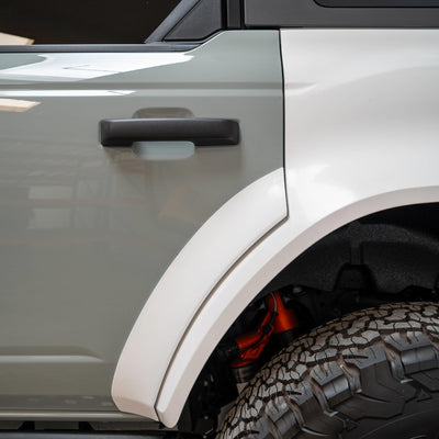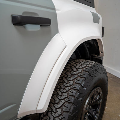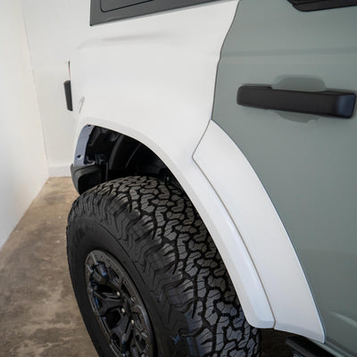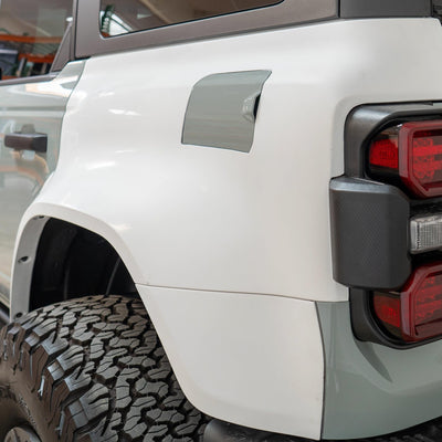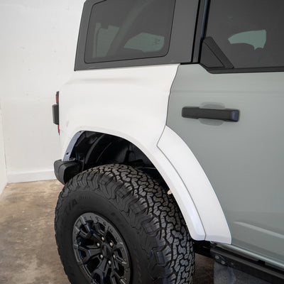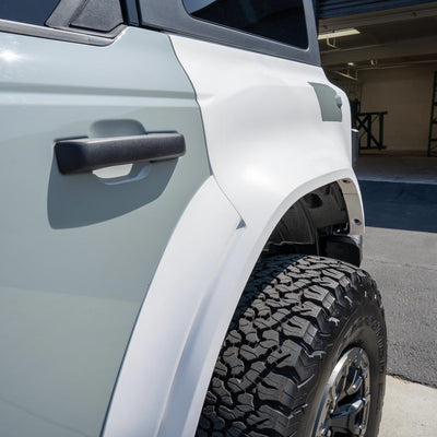 2022-2025 Ford Bronco Raptor flared rear quarter kit, hand-laid in the USA. Price includes set of two Bronco rear quarter panels (driver and passenger side), door caps (driver and passenger side), and rear bumper caps (driver and passenger side). Fiberglass kit comes standard in semi-gloss white. Bolt-on installation. These Bronco rear quarter panels are a perfect match with our 2022-2025 Bronco Raptor Flared Fenders to create a build that is ready for any terrain.